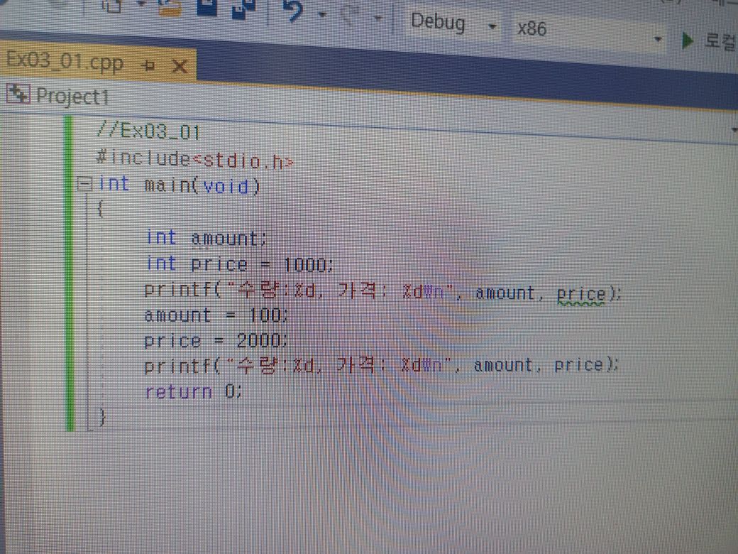 #include <stdio.h> int main() { int amount = 0; int price = 1000; printf("수량 : %d, 가격 : %d\n", amount, price); amount = 100; price = 2000; printf("수량 : %d, 가격 : %d\n", amount, price); return 0; }답변이 도움이 됐으면 합니다. 좋은 하루 되세요!