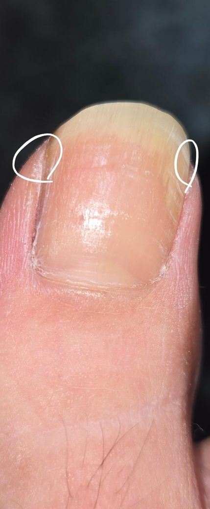 사진상 양측 발톱 측면에 약한 압통이 생긴 상태로 보이며, 단순 조갑진균증으로 인한 두꺼워짐만으로 설명되기보다는 초기 내향성 발톱(incipient ingrown nail) 또는 발톱 주위 연부조직 압박에 의한 통증 가능성이 함께 있습니다. 특히 “걷고 난 뒤 양쪽을 누르면 아프다”는 양상은 기계적 압박이 가해지면서 염증 반응이 시작되는 초기 단계에서 흔합니다.