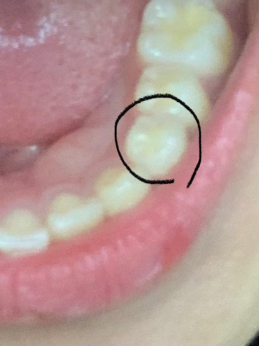 사진에서는 잘 보이지 않지만 충치가 생겼을 수 있으며 제거되지 않는다면 치과에서 치료를 받으시는 게 좋겠습니다.