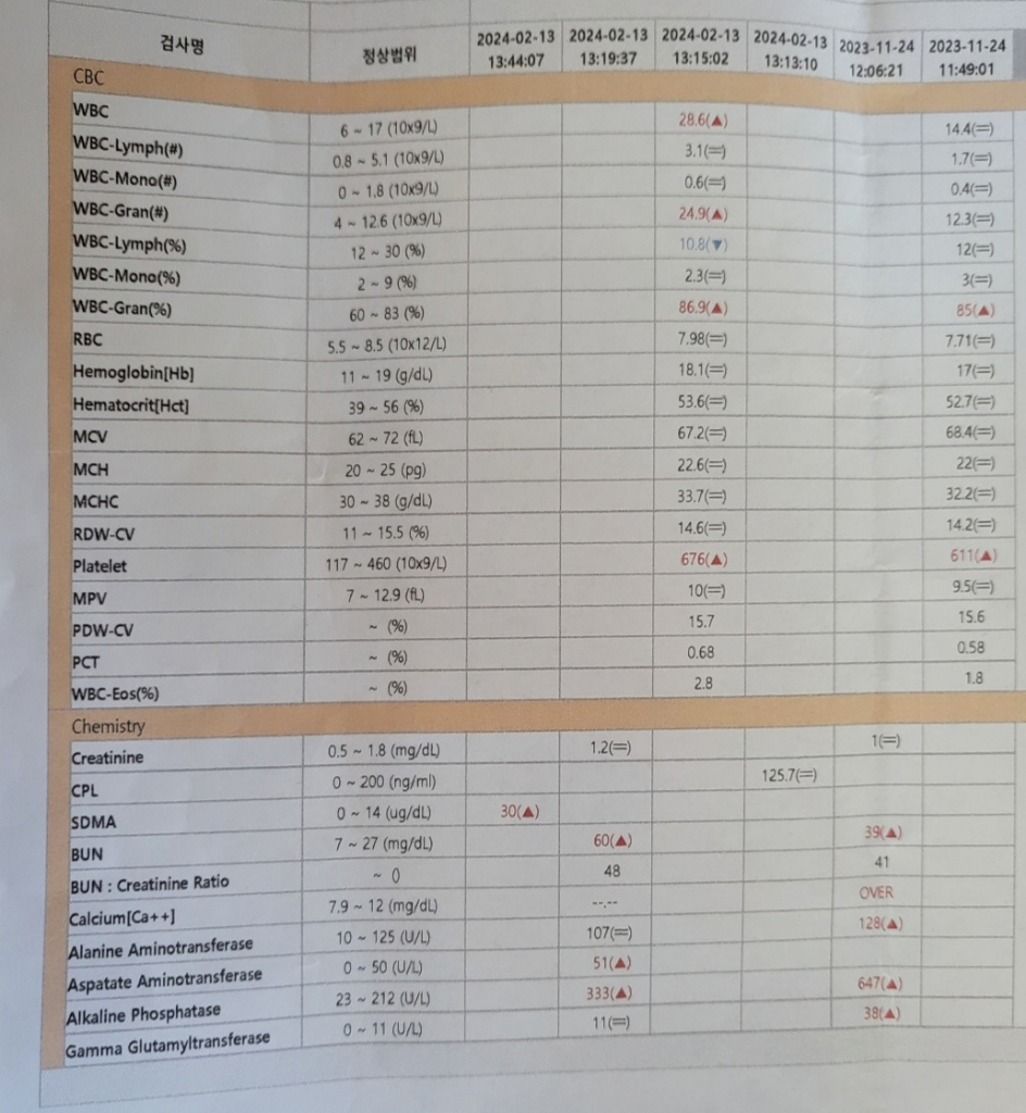최근에 실시한 혈액 검사지를 참고했을 때는 혈액 검사 수치 중 Sdma와 bun이 정상 수준보다 높게 검출이 됐네요. 아무래도 신장이 좋지 않을 가능성이 매우 큽니다. 주기적으로 수익을 받아서 신장 수치를 관리해 주시는 것이 좋을 듯합니다.