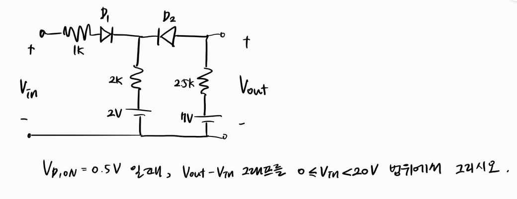 곧 시험인데 이 문제 vout-vin 그래프를 못 구하겠어요ㅠㅠ 사람 한명 구해주세요ㅜ 부탁드립니다!! D1,D2 둘다 문턱전압은 500mV로 가정하고 풀어주세요!