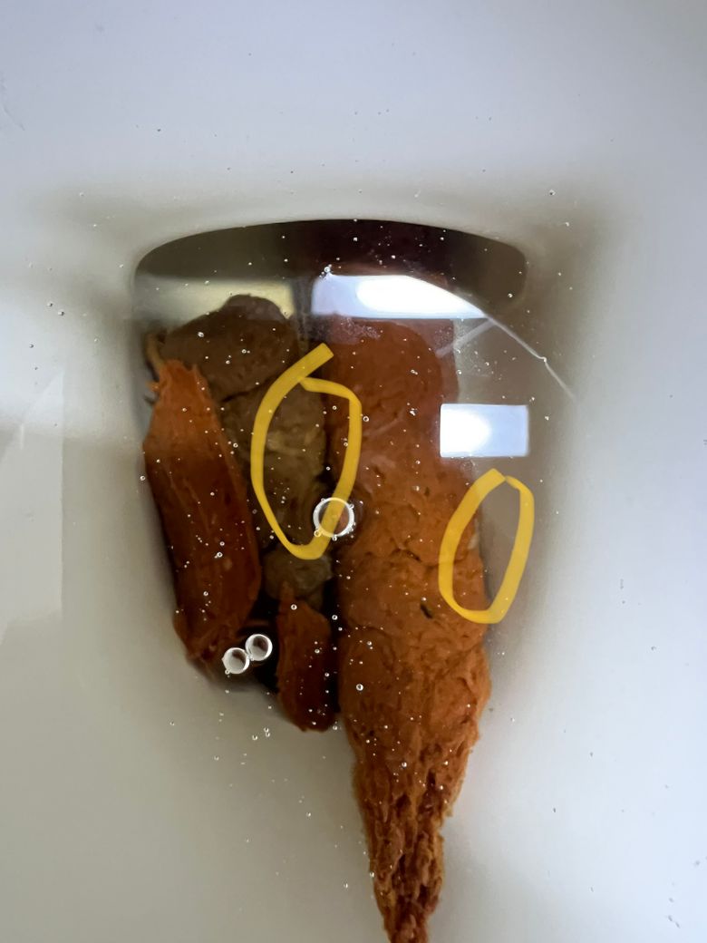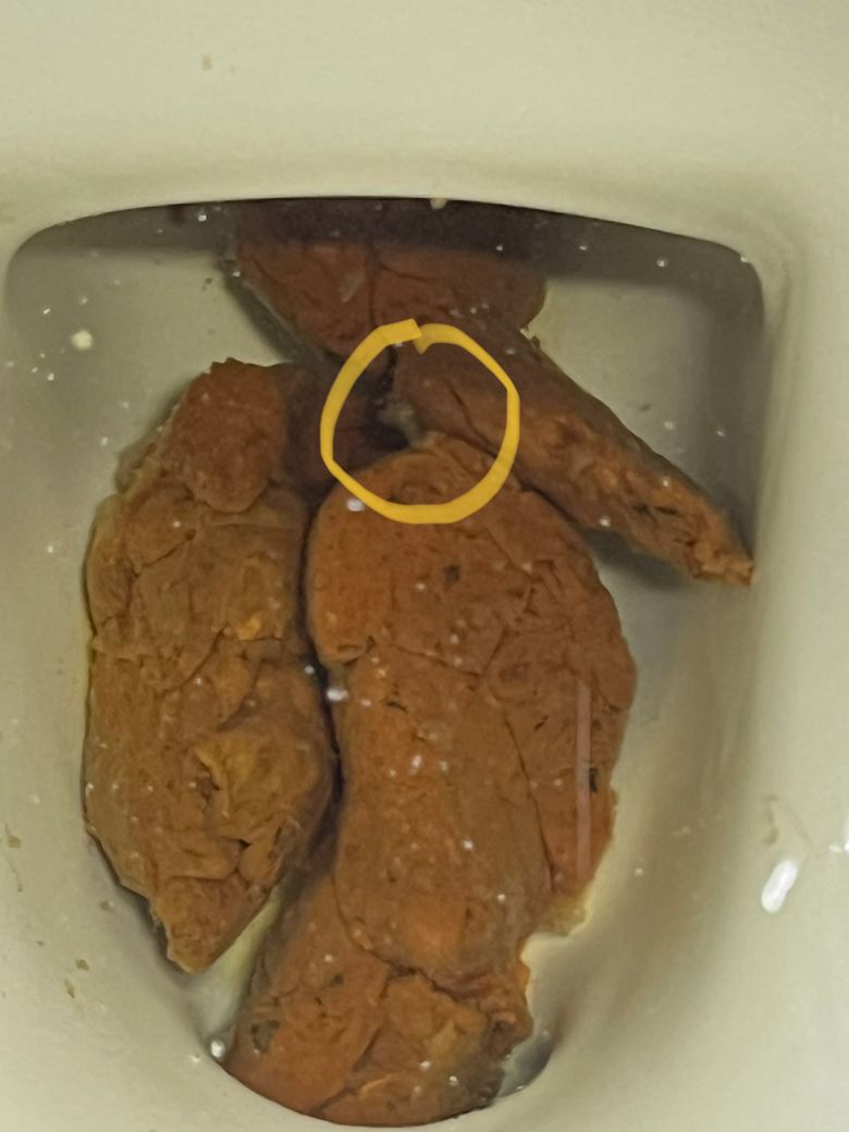 점액보다는 지방성분이 뭉친 대변으로 추정되는데, 점액은 투명하고 끈적한 양상을 보이니 알아차리기 어렵지 않습니다. 사진의 변에는 점액변을 의심할 소견이 보이지는 않는 것 같습니다.