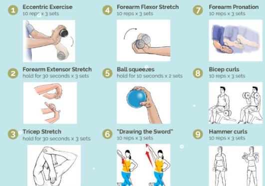 1. 팔꿈치 주변부 근육 강화를 위한 운동을 해주시거나, 악력 또는 어깨 안정성을 위한 운동을 꾸준하게 해주시면 좋겠습니다.