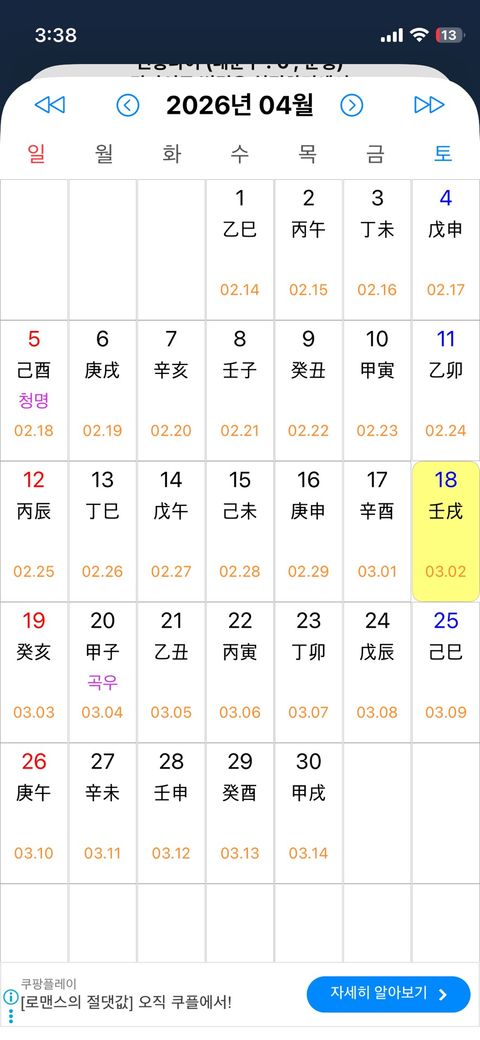4월 18일(왕진·편재), 20일(갑자·곡우), 22일(병인·상관), 26일(경오·편관) 네 날짜 중에서는