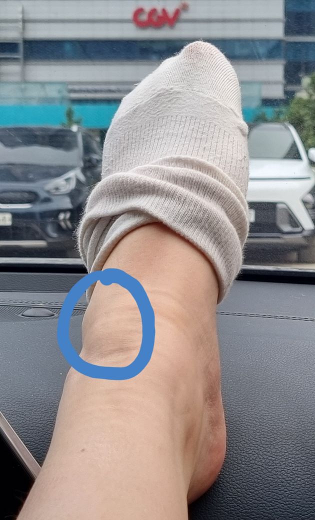 2.운동 전 스트레칭으로 발목을 돌리면 사진의 동그라미 친 부분 기준으로 발등으로 이어지는 쪽 까지 통증이 살짝 있습니다