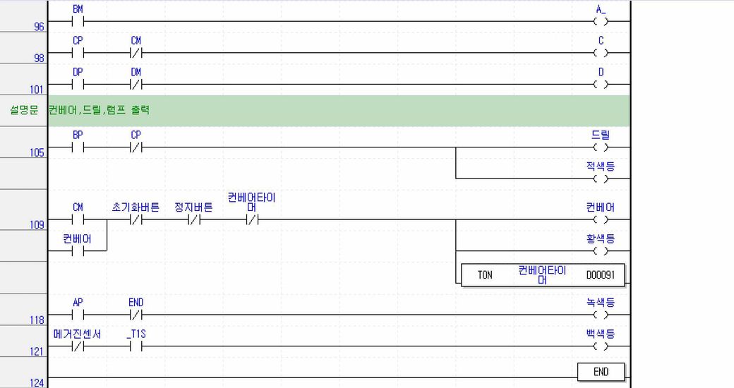 컨베이어 모터 동작 신호에 연동해 황색등 ON/OFF로직 작성 .금속 감지시 실린더D동작