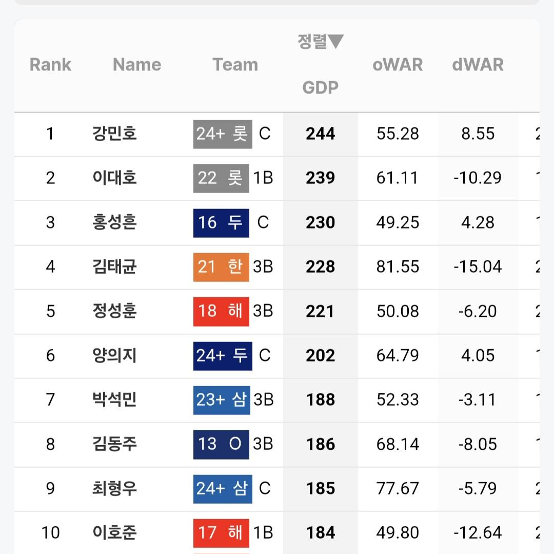 병살타의 특성상 순위에 우타거포들이 대부분이구요.