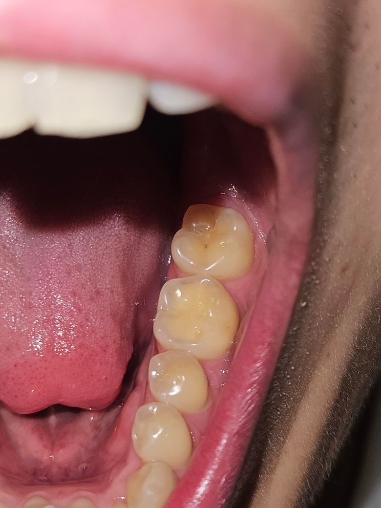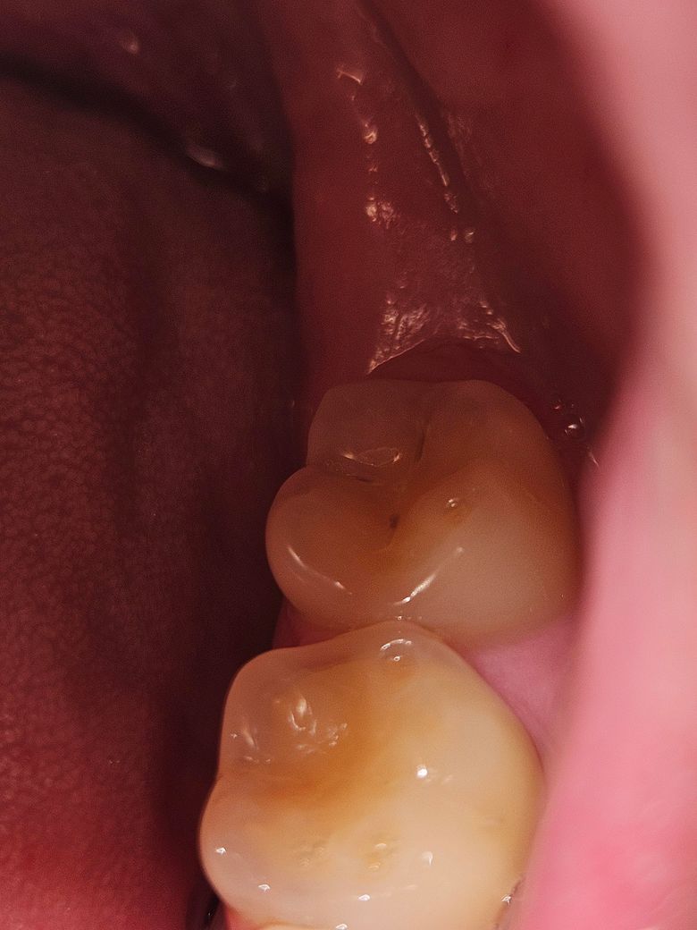엑스레이를 찍어봐야 정확히 알겠지만 위 사진만으론 치료가 필요한 정도의 충치는 아닐 것 같습니다.