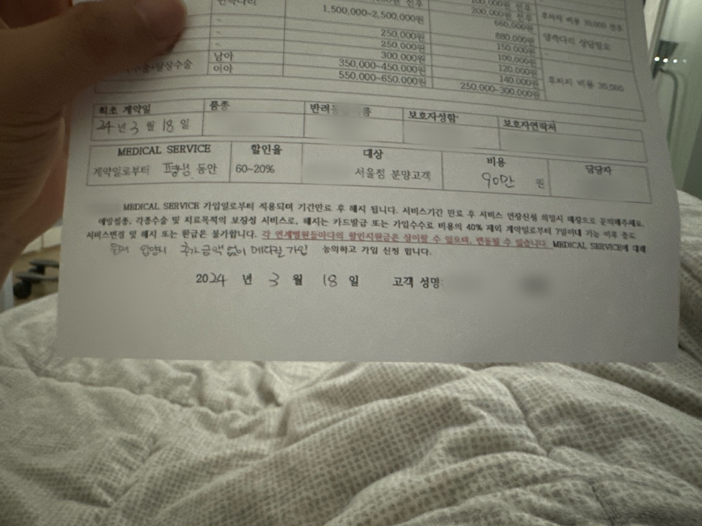 그러고 계약 과정에서 자기들이 제휴를 맺은 병원에서 효력을 받을 수 있는 고양이 보험을 소개시켜주었는데 1년, 6년, 평생 각각 세 종류로 가격이 다른 보험을 소개받았습니다. 그중 평생보장 보험으로 계약하여 추가로 90만원을 더 지불하였습니다. (계좌이체로 총 200만원 이체, 현금영수증 발행 완료)
