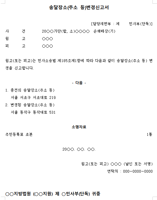 해당 양식은 원고와 피고가 각 당사자인 민사소송에 있어서 송달 주소 변경이지 위의 경우 별도의 고소장에 송달 주소를 기재하지 않은 경우라면 주소지의 변경이 필요해보입니다.