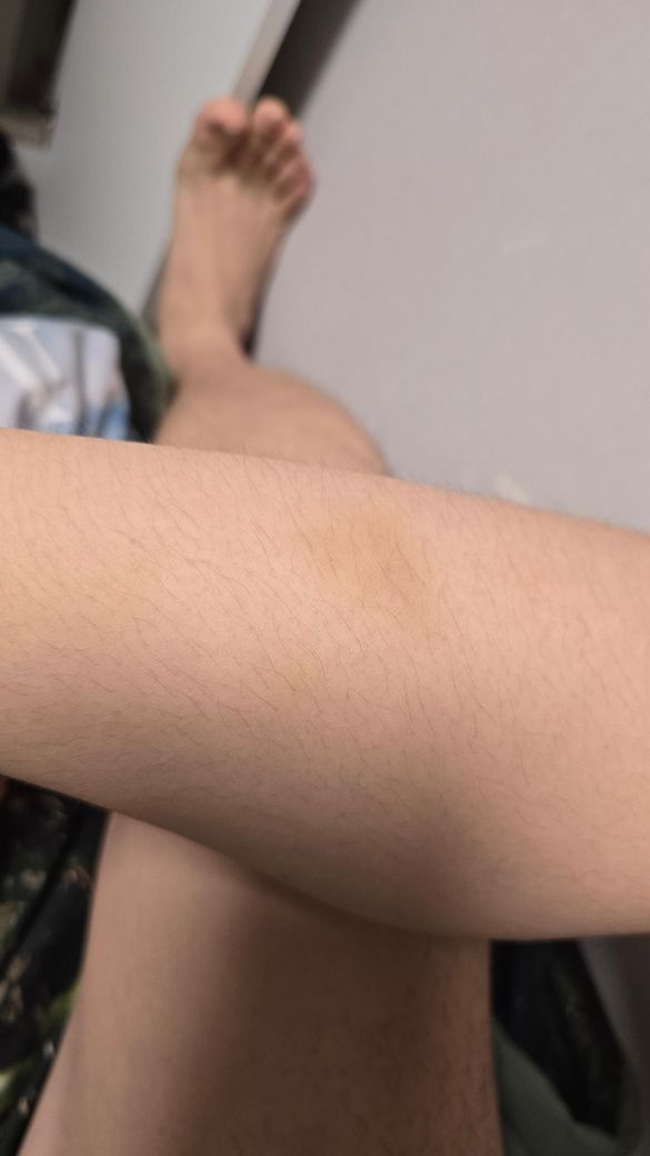 사진상으로 보이는 병변은 경계가 비교적 흐리고 색조가 옅은 황갈색 계열로, 전형적인 급성 멍(피하출혈)이 회복 단계에서 남는 색 변화와 유사합니다. 통증, 압통, 열감이 없고 크기 변화 없이 수개월간 유지된다면 활동성 출혈이나 염증 가능성은 낮아 보입니다.