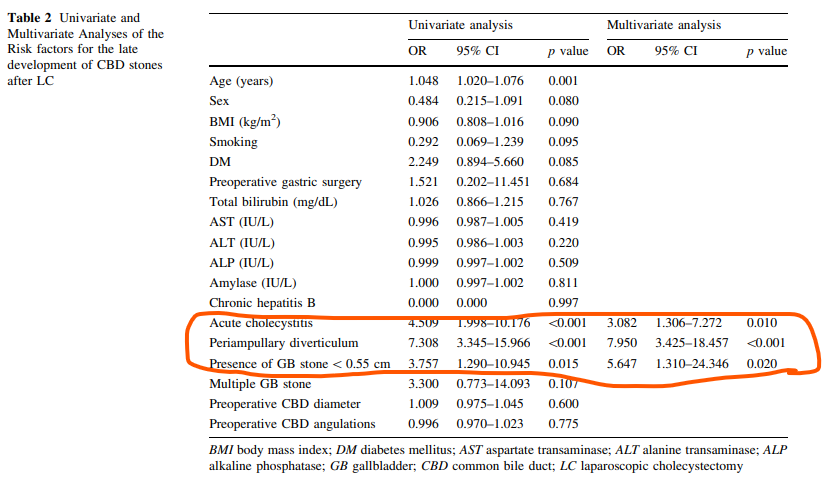1938명의 수술후 환자를 대상으로 담낭절제술후 담관결석에 영향을 미치는 인자를 분석을 하였을 때