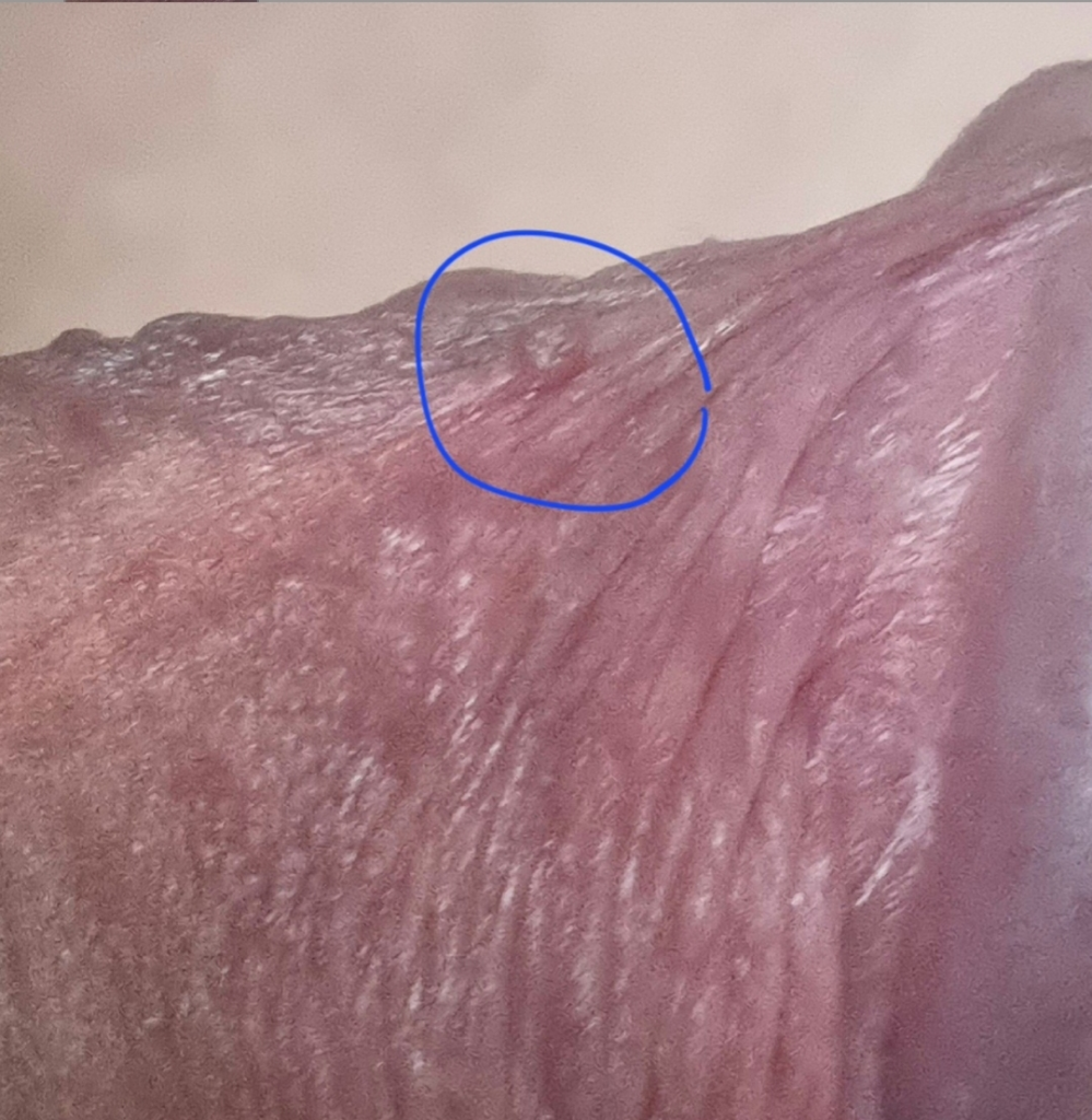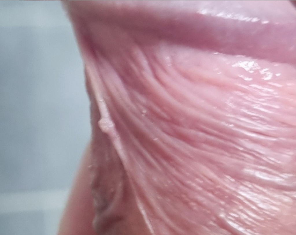 다른 의사 선생님께 확인했을 땐 피지낭종 혹은 섬유종(쥐젖) 가능성이 크다고 하였습니다. 포경은 안했으며 포피소대 끝부분에 있습니다