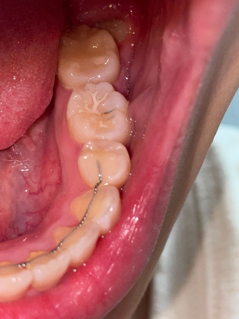 어금니에 치아홈메우기(실란트)를 하신 것 같은데 그게 일부 떨어졌습니다. 그리고 그 틈새로 이물질이 들어가 있는 상태로 보입니다. 충치의 양상으로 보여지진 않습니다. 다만, 저대로 두면 충치가 유발될 확률이 매우 높습니다.