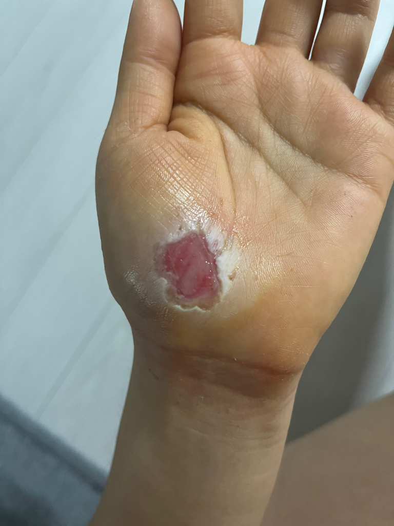 사진의 소견으로 명확하게 감별하기는 어렵지만 2도 화상으로 보입니다. 관련하여서는 최대한 화상 드레싱을 하면서 아물도록 기대해볼 수 있는데, 만약 그럼에도 회복이 잘 되지 않는다면 피부 이식과 같은 치료를 고민해보아야 할 수도 있습니다.