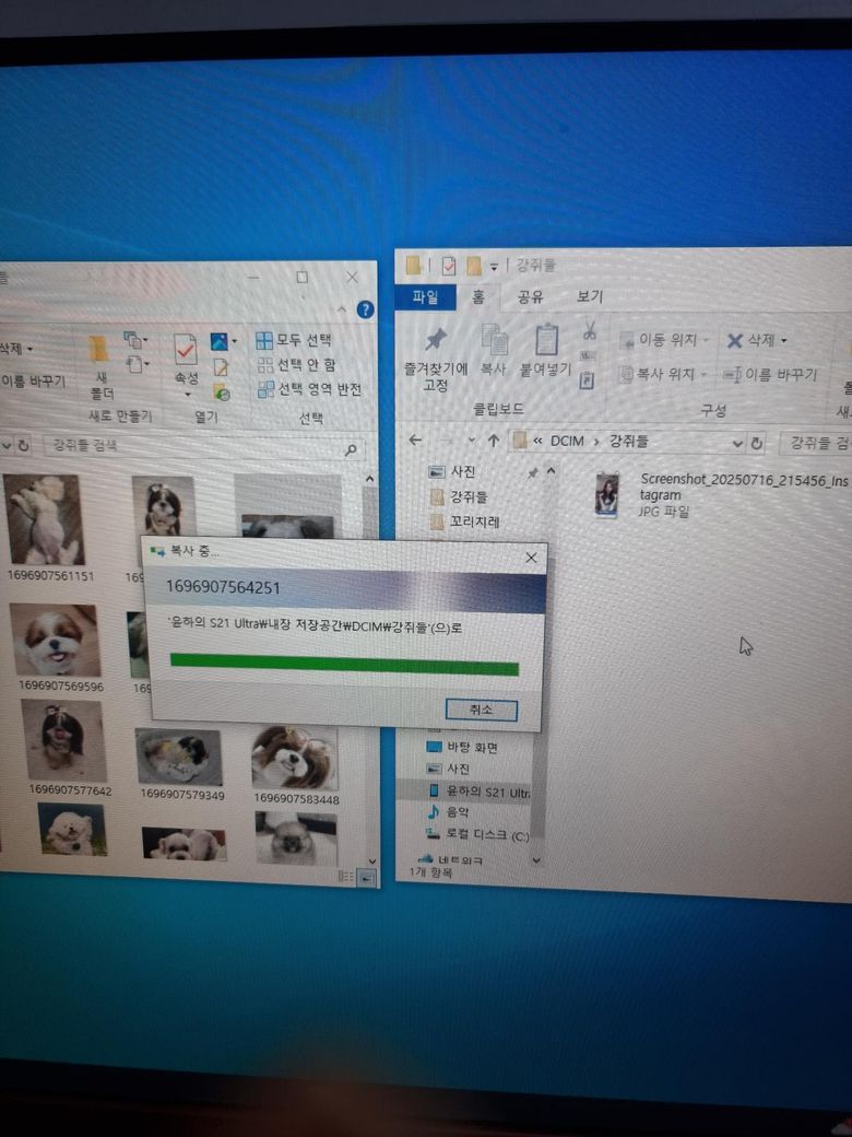 안녕하세요~ 컴퓨터에 있는 사진과 영상을 제 핸드폰(갤럭시 울트라 21) 으로 옮기고 싶은데 사진처럼 복사중이라고 뜨고 끝나도 옮겨지지가 않아요 ㅜㅜ 도와주세요