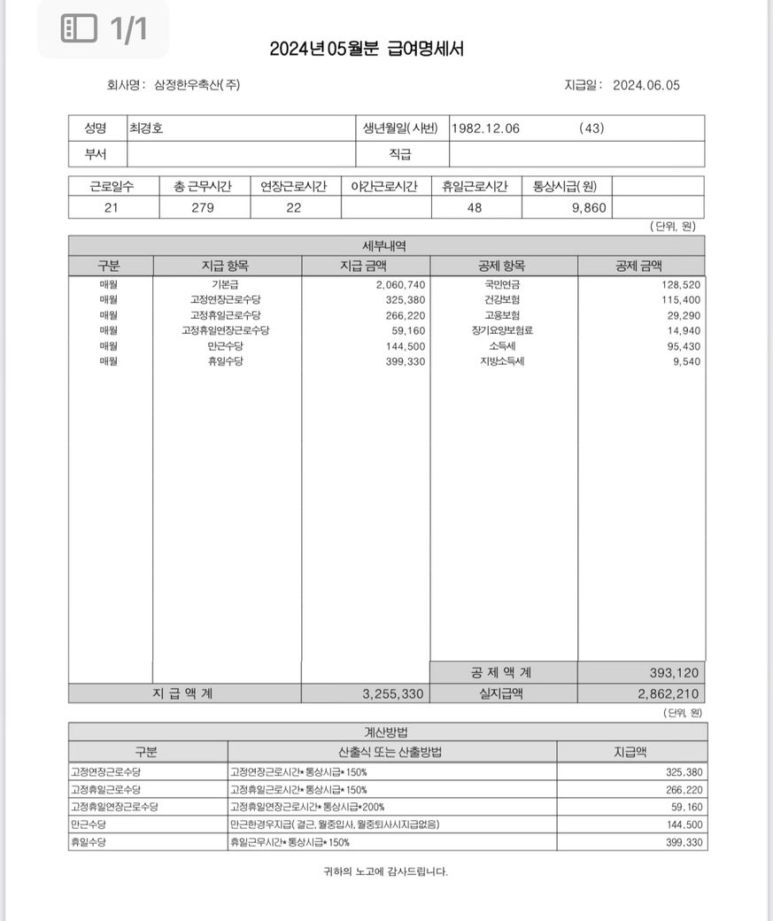 급여명세서 의 근로시간 과 급여는 일치를 하고 이번 5월에 공휴일 3일근무 가 휴일수당으로 추가금액이