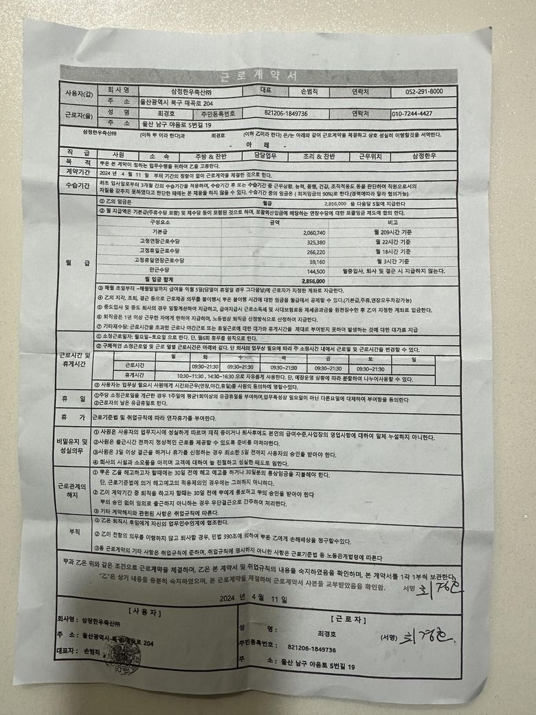 급여도 근로계약서 상의 내용과 동일 합니다만,