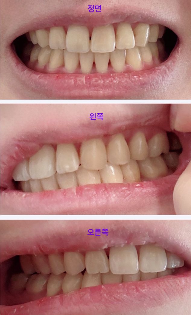 그리고 재교정 치아교정 받았고 밑에사진 오른쪽위 송곳니 자이 한칸씩 당겨서 교정했고 왼쪽 교합점이 높고 오른쪽이 낮은느낌.