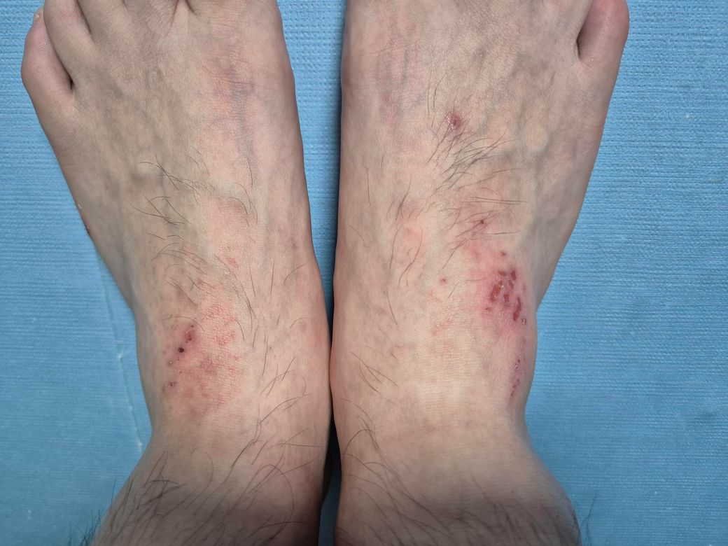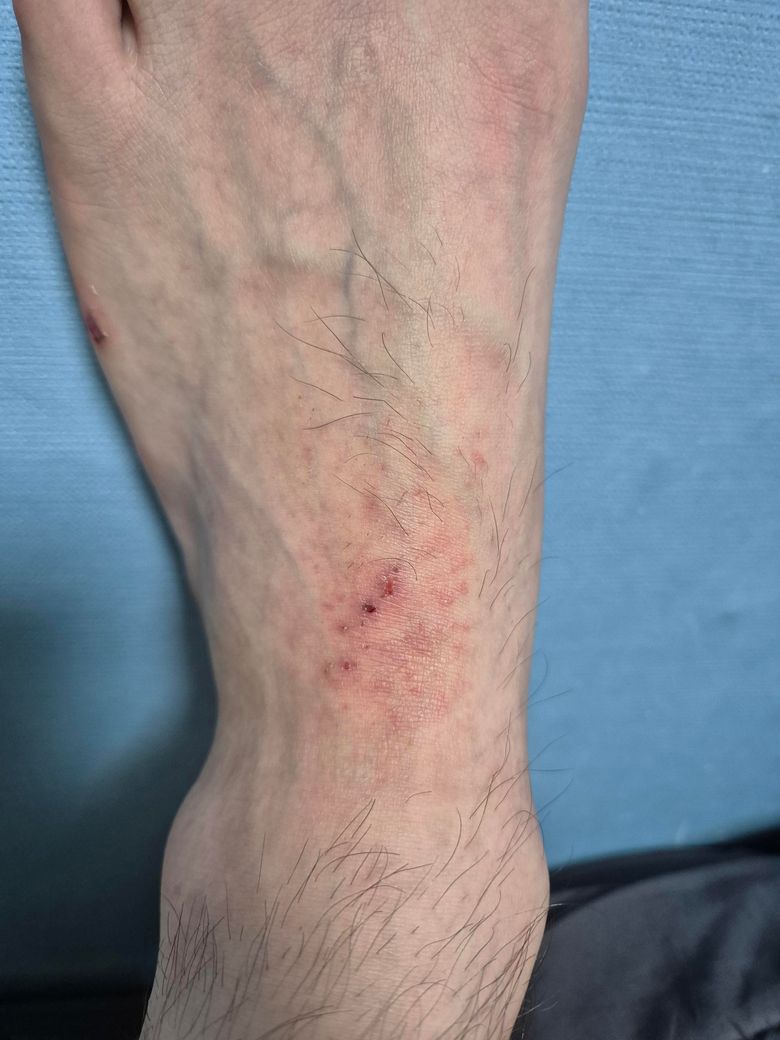 긁으셨나요? 보기에는 심하게 긁어서 상처난 거 같은데 피부 감염, 염증성 질환, 건조증, 혈액 순환 문제 등이 있을 수 있습니다.정확한건 피부과 진료 받아보셔야 할 듯 합니다.