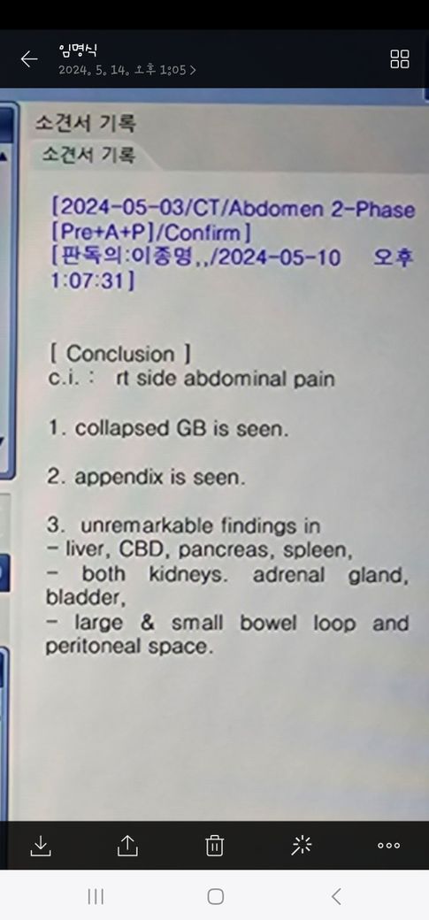 결과적으로, 복부 CT에서 오른쪽 복부 통증의 원인으로 보이는 특이한 이상 소견은 없습니다. 담낭이 찌그러져 있는 상태는 금식이 충분치 않으면 보일수 있는 생리적 변화로 판단됩니다.