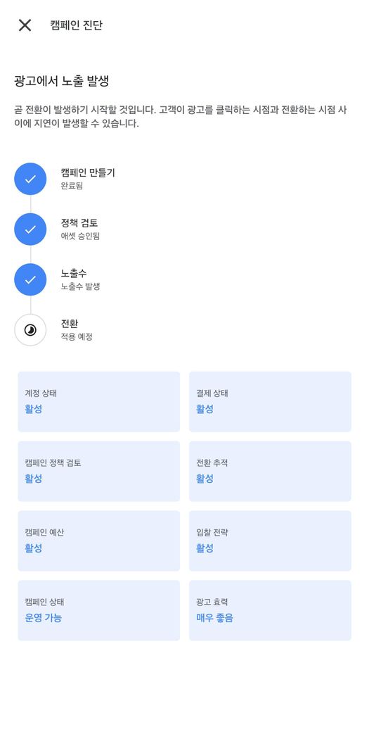 계정 문제: 계정이 정지되거나 결제 문제가 발생하면 광고가 노출되지 않습니다. 계정 상태는 Google Ads 대시보드에서 확인할 수 있습니다 .