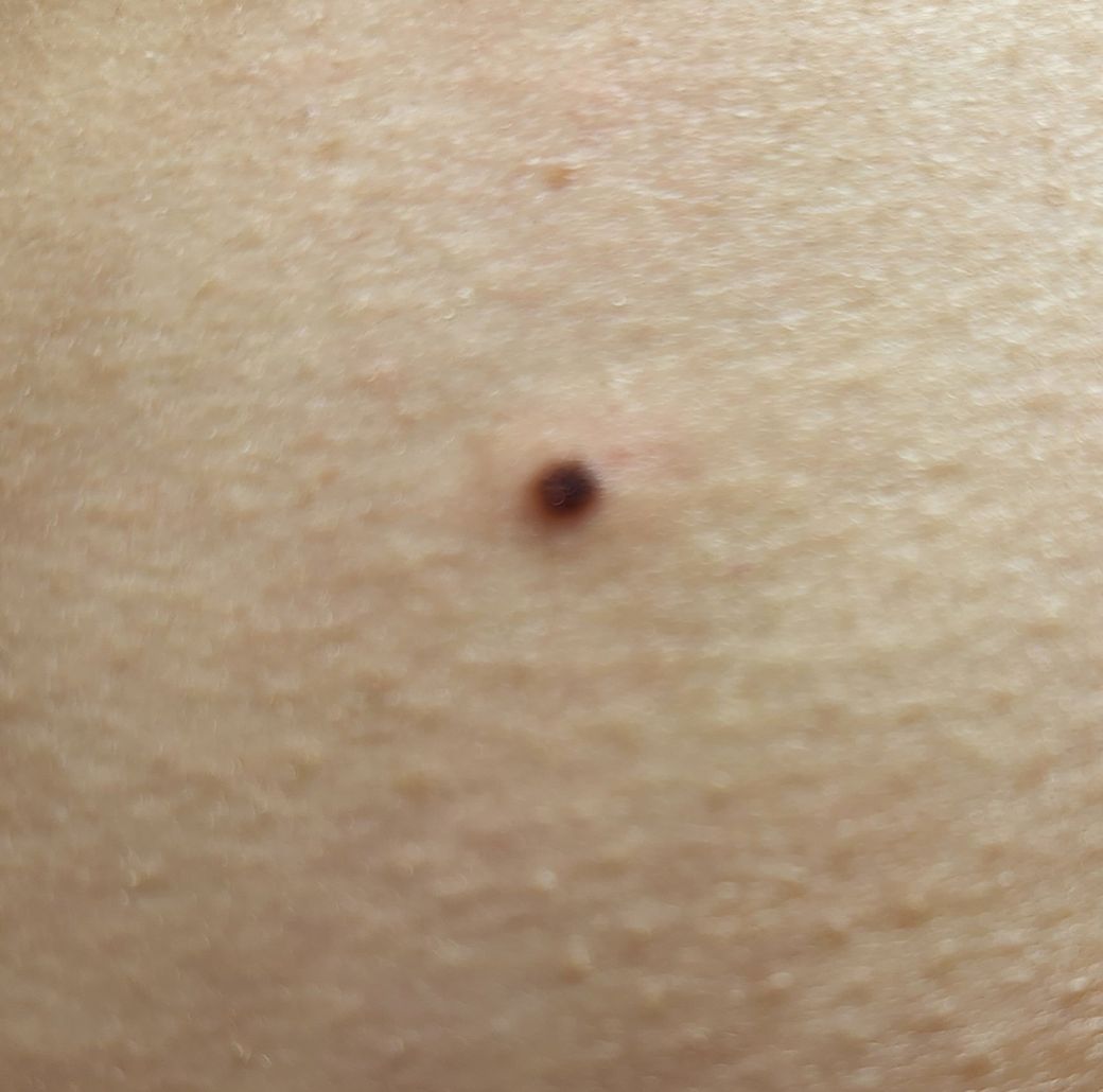 양성의 경계성 모반 즉 일반 점으로 보이며 간혹 상처 부위에 딱지가 앉은