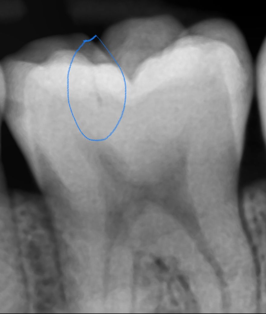 법랑질 넘어 상아질까지 찍 줄이 그어져있는데요 그저 교익방사선찍을때 찍힌 잔상인가요? 파노라마에서는 안보였는데 교익사진에서는 보여서 질문드려요 감사합니다