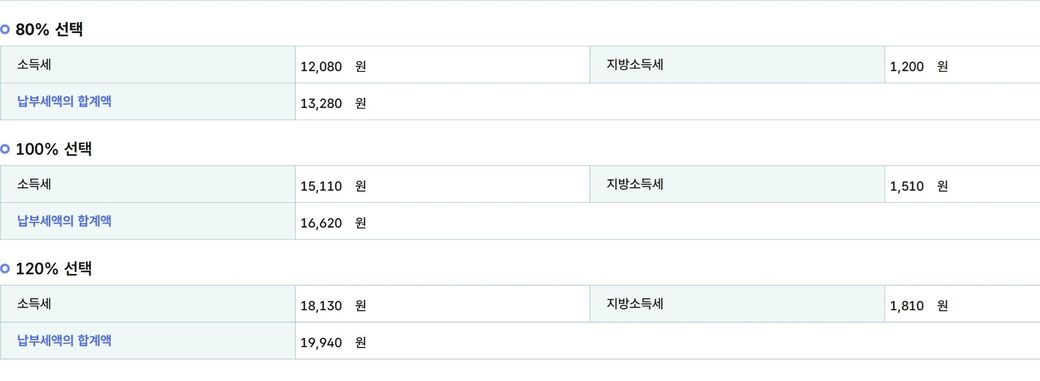 80%, 100%, 120%은 월급여에서 차감되는 소득세를 설정하는 것입니다. 연말정산을 하게 되므로, 어떤 항목을 선택하든 정산되는 금액은 같습니다.