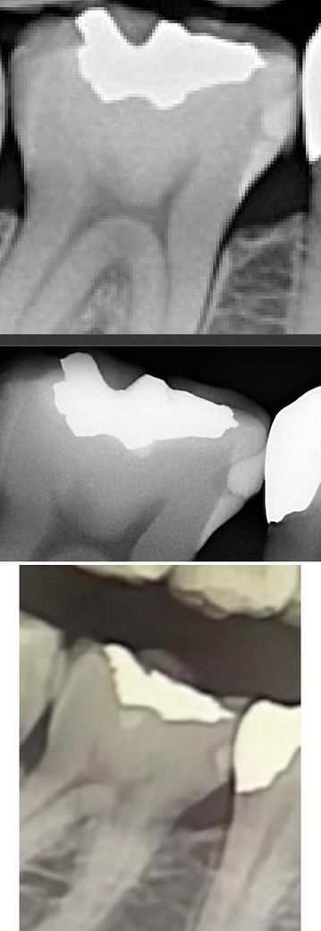 안녕하세요, 사진에 보이는 인접면 충치를 치료해야 하나 고민이 있습니다. 위부터 순서대로 재작년 11월, 작년 8월, 올해 1월에 찍은 사진입니다. 오른쪽에 금 인레이를 해주셨던 선생님은 3년 정도 더 관리하면서 지켜보자고 하셨고 어떤 치과에선 치료하는게 좋을거 같다고 했습니다. 나름 열심히 관리하면서 지켜보고 있는데, 이게 관리하면서 지켜볼만한 충치인지 아니면 치료를 해야할지 고민입니다.
