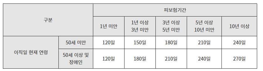 고용보험 가입기간에 따라 구간별로 수급일수가 늘어나게 됩니다.