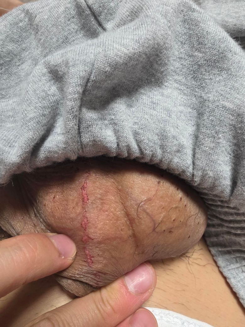올려주신 사진과 내용으로 미루어 볼때 성병보다는 착용한 옷의 소재가 마찰되어 생긴 상처로 보여 덧나지 않도록 소독과 상처 연고를 발르시면 수일내 좋아지겠습니다.