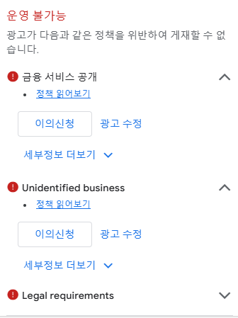 구글애즈 광고 운영 불가능 어떤걸 추가해야 되나요 ?