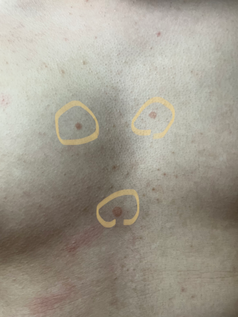 진균 감염성 질환 등의 피부질환 감별이 필요하니 가까운 피부과를 방문하시기 바랍니다.