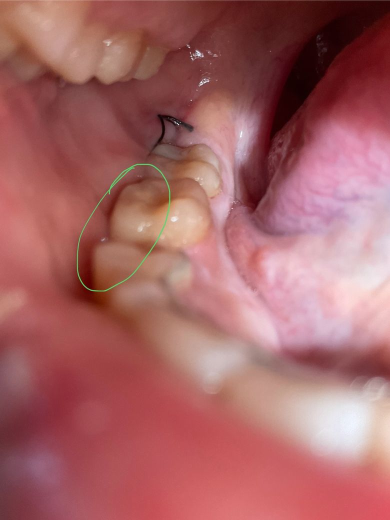 사진상 동그라미 친 치아들 옆에 있는 실밥 매듭쪽 건들면 약간의 피가 나고 실밥이 매듭 부분제외하곤 볼쪽으로 파묻혀있는 것이 보이기도 합니다