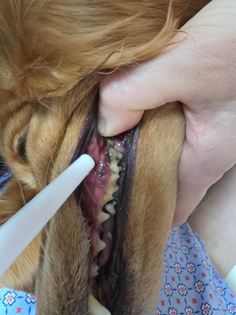 치석은 음식물 잔여물과 세균이 침의 무기질(칼슘, 인 등)과 결합하면서 단단히 굳은 형태로, 주로 잇몸과 치아가 맞닿는 경계 부위에 생깁니다. 색깔은 노란색 → 갈색 → 검정색으로 점차 어두워지며, 거칠고 불규칙한 표면을 보입니다. 닥스훈트는 구강구조상 치석이 쉽게 쌓이는 견종이기 때문에, 말씀하신 위치와 색이 맞아떨어집니다. 이 경우 스케일링(치석 제거술)로 대부분 깨끗하게 제거됩니다.