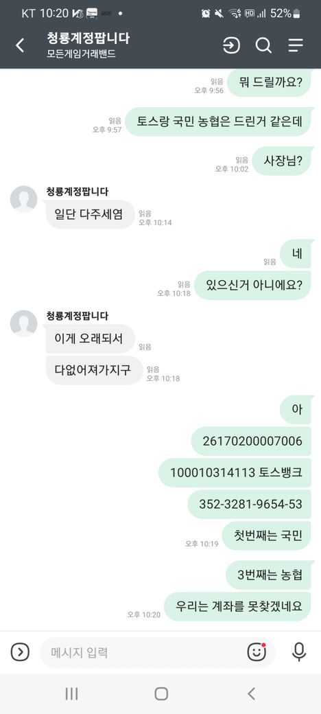 사기꾼이 처음에 밴드에 계좌를 빌려주면 3만원을 주겠단 글을 보았습니다.19살인 저는 계좌 빌려주는게 불법인지 모르고있었습니다.사기꾼이 시키는 방법은 자기가 돈을 제 계좌로 보내줄테니 3만원 떼고 atm출금코드를 보내줘라 라는것이었습니다.혹시나 사기를 칠까 물어보았지만 아니라고 여자친구한테 들키면 안되서 그런다 라고 하였습니다.또 제가 돈을 들고 연락두절 될수있으니 주민등록증을 보내달라해서 뒷자리를 가리고 보냈습니다.1~2주후 다른계좌를 자꾸 요구하길래 혹시나해서 더치트를 깔아 제계좌 조회를 해보았습니다.사기피해사례가 생겼더군요.저는 당황해 그사람과 대화한 내용을 캡처할 생각을 안하고 지우고 뒤늦게 생각이나 밴드를 다운받았습니다.그러나 대화내용은 이미 다 지워진상태..고객센터에 문의하니 복구가 되지 않는다더군요.그래서 증거를 어떻게든 남기려고 속아주는척하며 다시 대화를 하였고 제가 계좌를 주고 그사람이 돈을 넘겨주는데까지 대화내용을 캡처했습니다.그리고 그사람이 눈치를챘는지 차단을했고 저는 새계정을파 새로운 피해자인척하며 대화를하였고 여자친구에게 들키면 안되서 그런다 같은 저를 기망하는 내용을 캡처했습니다.이 일이 있고 저는 전자금융거래법 제49조 6항 1호 2호에 해당되서 전자금융거래법 처벌을 받는다는것을 알게되었습니다.그런데 로앤굿에 글을 올렸더니 사기방조죄도 해당될수 있다 하시더군요..현재 피해자 세분이 있고 한분은 연락할 방법이 없어 못했으며 저를 더치트에 신고하신 두분과는 연락이 닿아 한분은 피해금액을 주면 합의하신다하시고 한분은 고소를 진행하였습니다.피해자분들은 제이야기를 듣고 제 처벌을 원치 않으시더군요.증거가 많진않지만 도움이 될지와 제가 얼마나 처벌을 받을지 궁금합니다.전자금융거래법은 처벌받아도 제가 인정할것 같지만 사기방조는 아니라고 생각을해서요..저계좌 잘못보낸건데 까지가 본계정 그이후가 새로만든계정입니다.피해금액은 합해서 80만 5천원입니다.