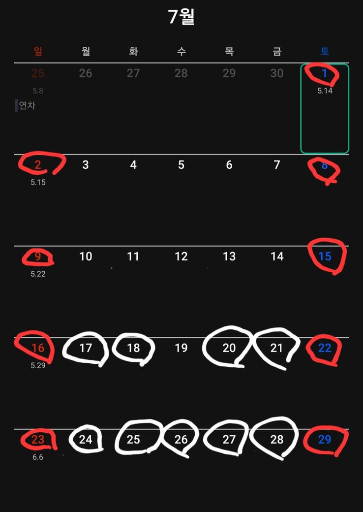 빨간색 동그라미 (토,일)이 원래 근무시간(12시~6시) 5시간 이고, 흰색 동그라미가 평일에도 바빠서 추가로 근무한 시간입니다 (10시~7시) 8시간 근무했습니다