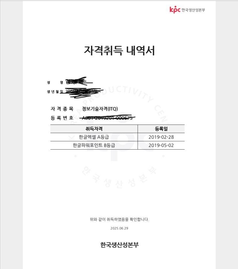 취업 등 서류제출시 마스킹하는 개인정보는 주민등록번호입니다. 성명, 생년월일, 자격증번호는