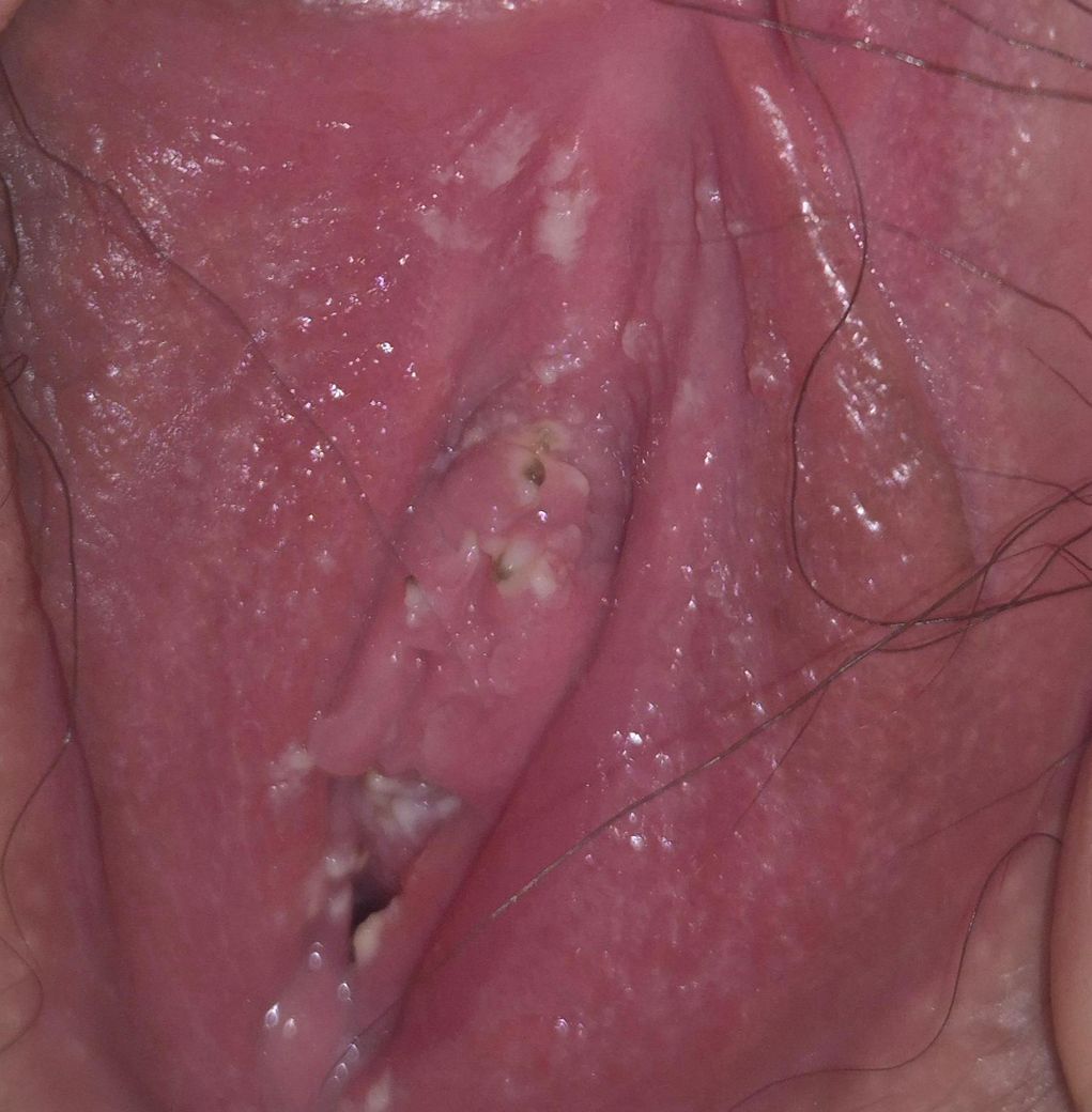 곰팡이 감염 가능성 있어보입니다. 사진과 증상만으로 단정은 어렵지만, 현재 보이는 양상은 전형적인 2형 헤르페스와는 거리가 있습니다. 헤르페스는 보통 작은 물집들이 모여 생기고, 심한 통증·따가움이 먼저 나타난 뒤 물집이 터지며 얕은 궤양으로 진행하는 형태가 흔합니다. 반면 사진에서는 물집보다는 흰색의 덩어리·찌꺼기처럼 보이는 부위와 점막의 자극 소견이 더 두드러집니다.