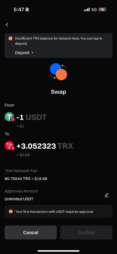 현재 사용하신 체인은 트론체인이며 이에 대해서 TRX코인인 트론이 소량 필요합니다 즉 트론이 지갑내에서 보유가 되어야 트론체인을 활용한 테더를 스왑할수가 있습니다.