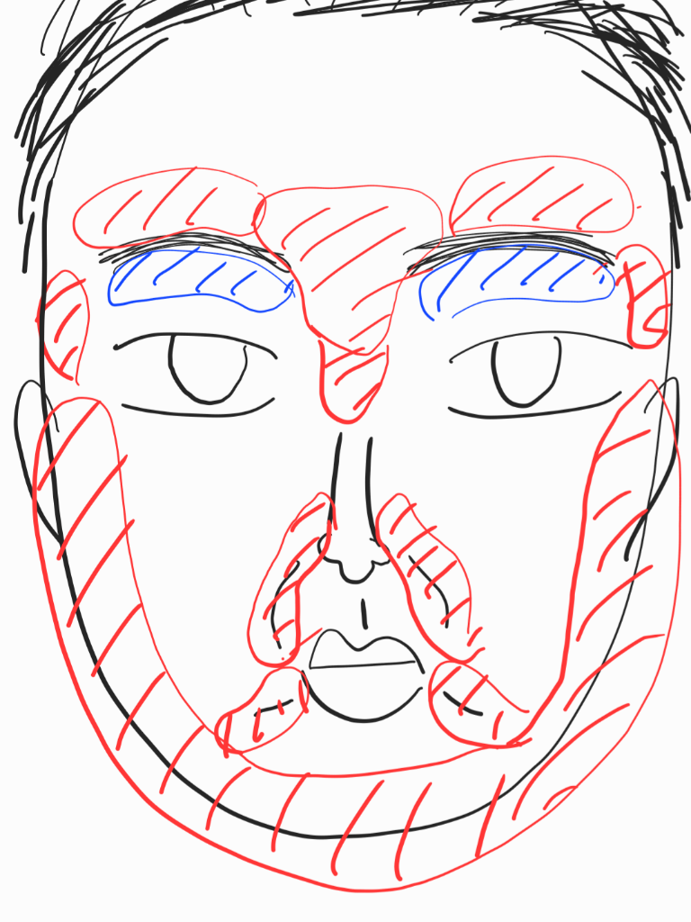 미간이나 팔자주름, 마리오네트(입가의 심술보 주름), 그리고 위 사진의 빨간 삼각형 부분은 신경이 많이 모여있는 부분으로 알고 있는데