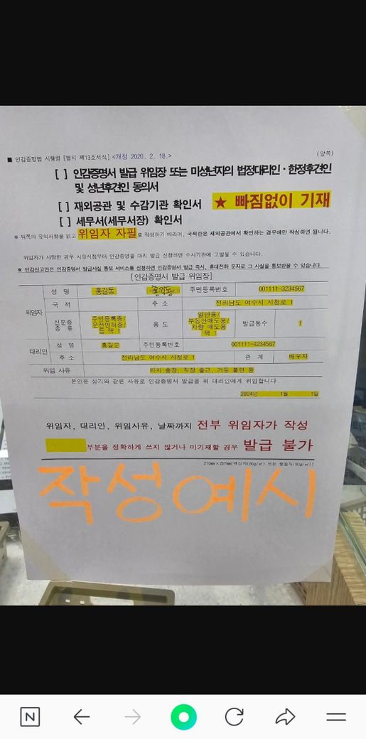 급하게인감증명서 발급위한 위임장 양식을 출력하려는데요...문제는 상황상 당장 출력가능한 여건이 안돼서요ㅠ혹시 그 양식을 수기로 그대로 만들어작성하면 안되는거 맞을까요?ㅠㅠ