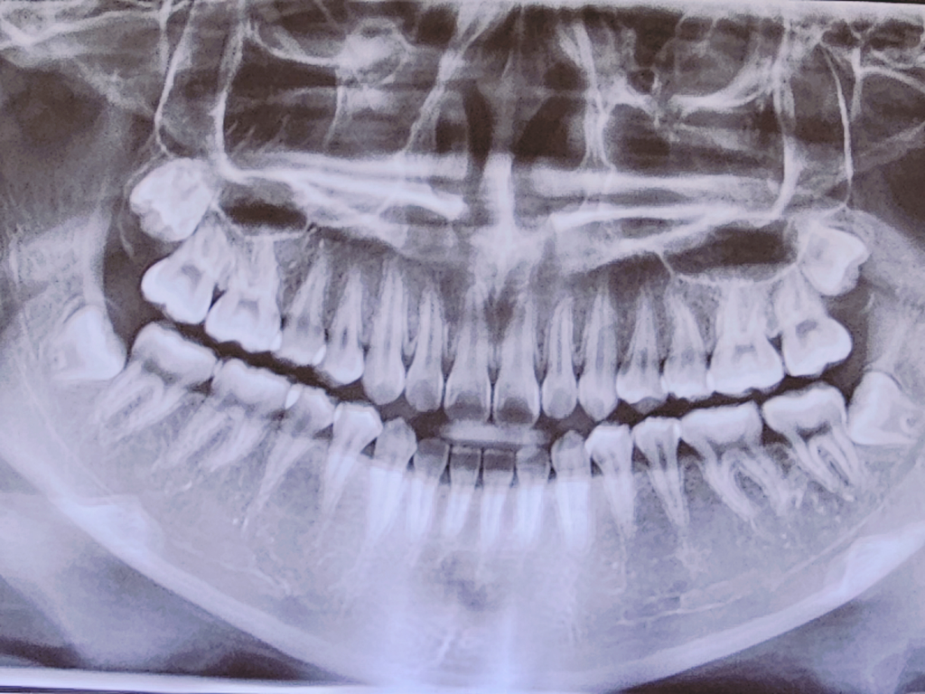 파노라마 방사선 사진만으로 판단하기는 쉽지 않으나 두번째 앞니가 살짝 높이가 안맞고 세번째 치아(송곳니)가 조금 회전된 것 같습니다