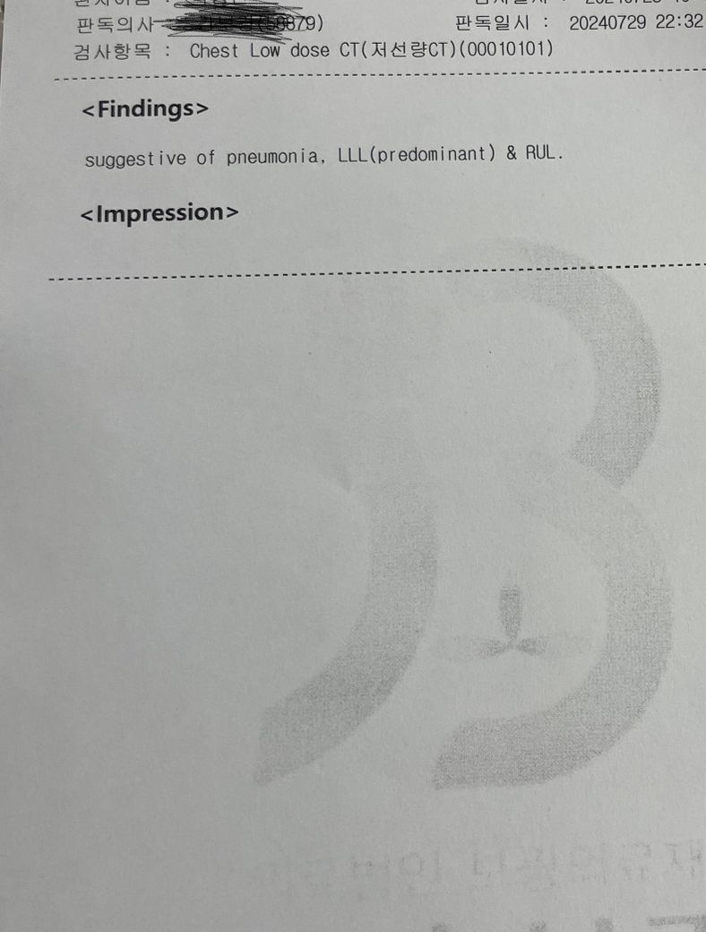흉부 CT의 판독지에 대해 궁금하시군요. 해석하신대로 suggestive of pneumonia, LLL(predominant) & RUL은 흉부 CT에서 폐렴이 의심되고 좌하엽이 가장 두드러지며 우상엽도 폐렴이 보이고 있다는 의미입니다. 폐렴은 단순한 염증이 아니라 감염증에 의한 질환이므로, 폐렴이 의심되는 영상소견을 보였다면 내과적 진찰 및 치료가 필요합니다. 따라서 해당 결과에 대해서는 반드시 진료가 필요합니다.