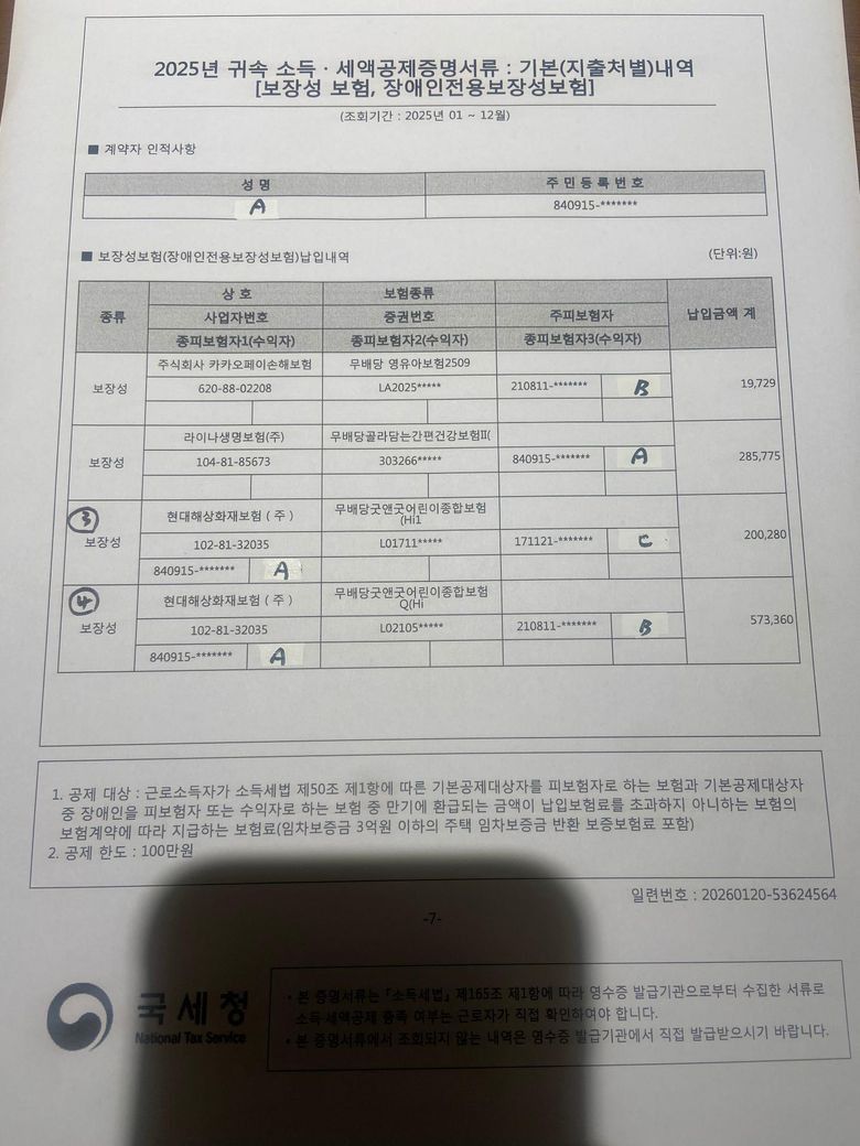 위 사진상의 자료를 볼때 계약자인 A가 보장성 보험료를 계약하고 납부를 하는데