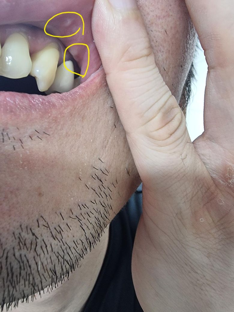 윗 입술안쪽과 얼굴 볼안쪽에 사진속 노란색 체크된 부불 살이 볼록(?)나온 것을 우연히 발견했는데 통증은 없고 딱딱하지도 않아요