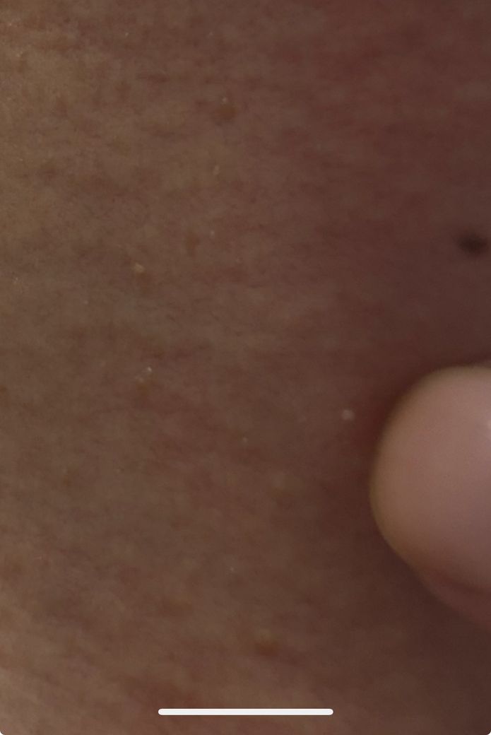 사진만 봤을 때는 좁쌀만한 흰 병변을 말씀하시는것이라면 피지와 같은 노폐물이 쌓여서 발생한 병변으로 보입니다.