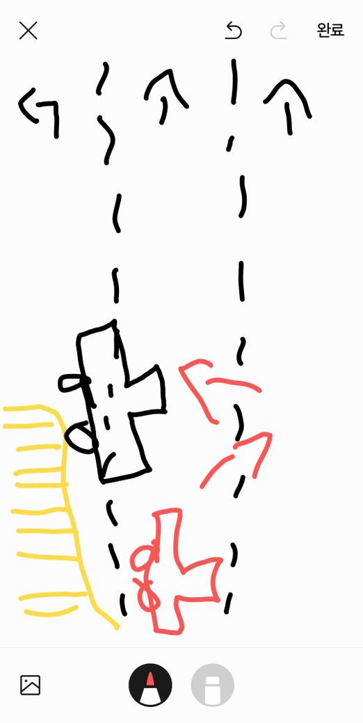 노란색은 안전지대인데 제가 2차로에서 좌회전차선으로 서서히 차선변경하는 와중에 제 뒤에 있는 차가 3차로 에서 2차로로 끼어들면서 제 사이드미러를 완전히 박살냈습니다.