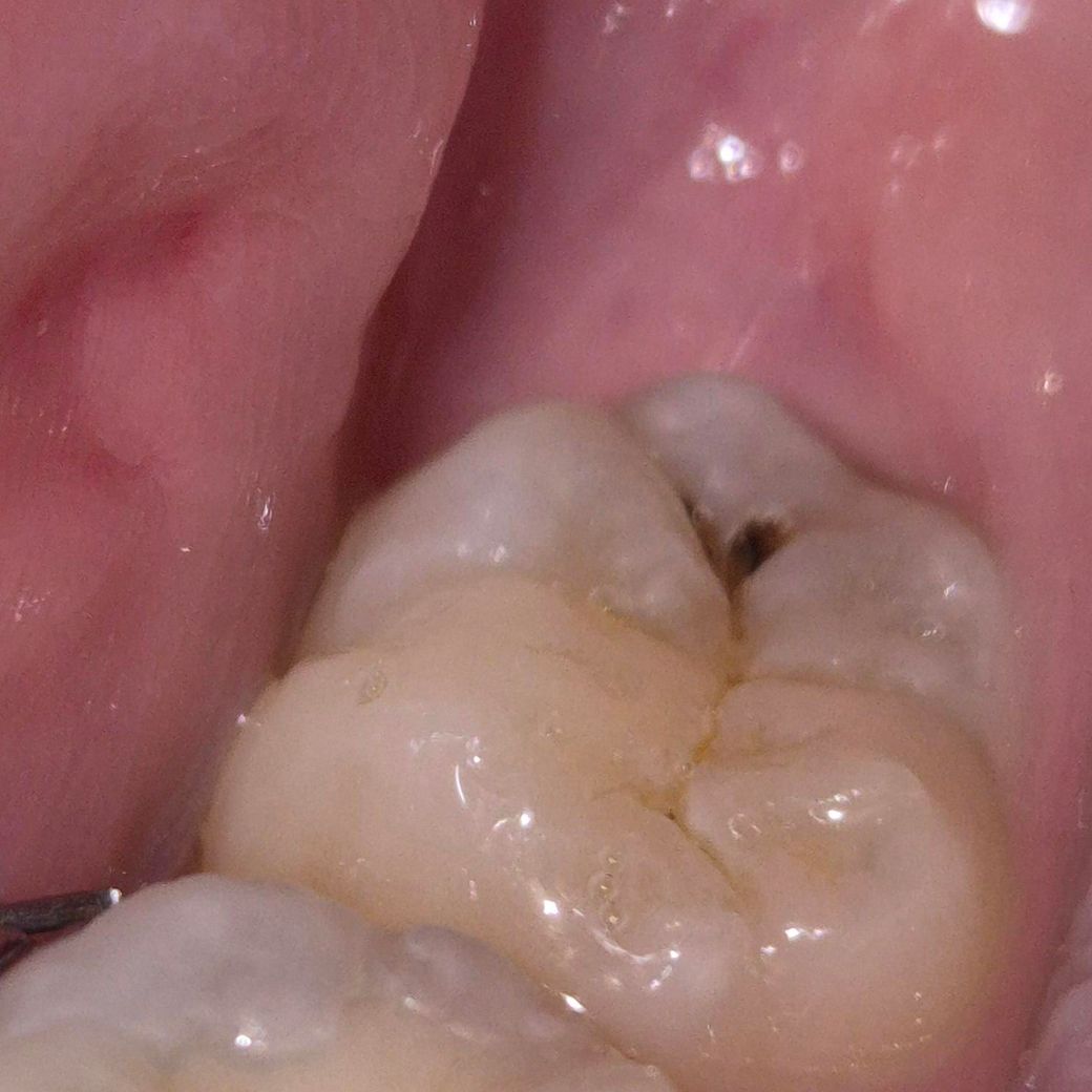 초기 충치의 단계는 아닙니다. 충치가 어느정도 진행이 되어 법랑질구조의 파괴는 일어났습니다. 개인적인 판단으로는 사랑니를 발치하지 않고 충치치료하여 쓸 계획이라면 너무 늦지 않게 치료하는 것이 좋을 것 같습니다.